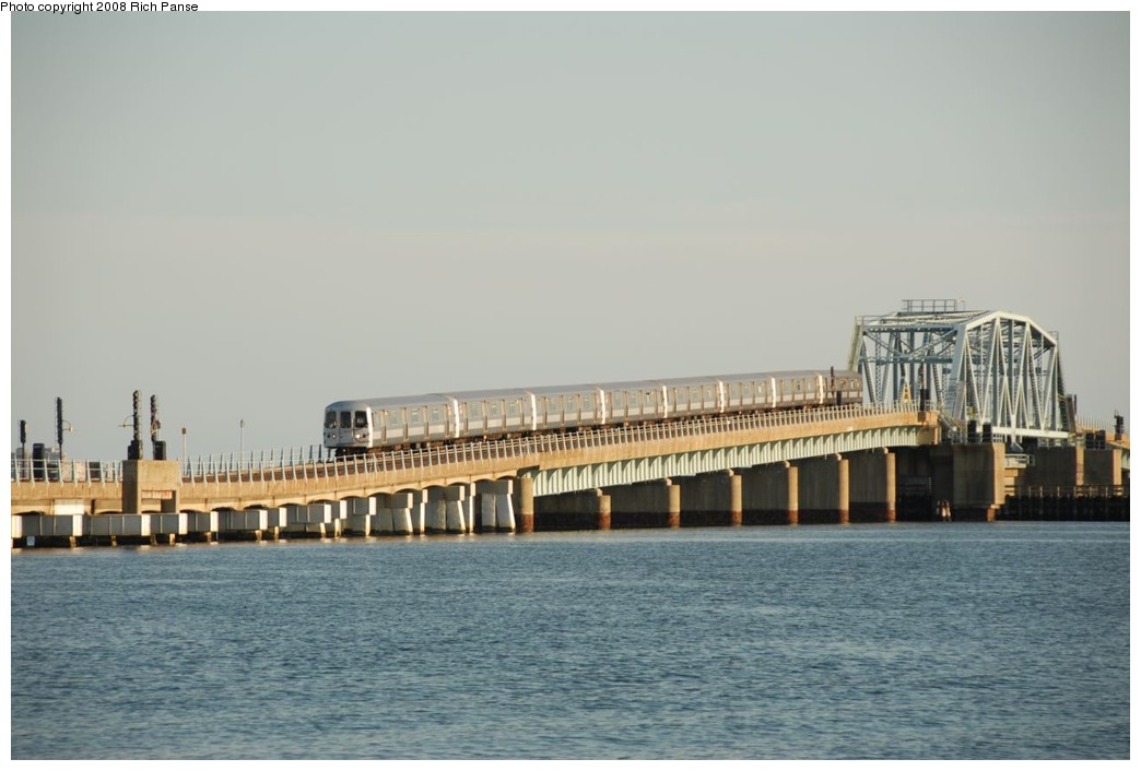 A train is crossing a bridge over a body of water. The bridge has multiple arches and is supported by pillars. The train is white and blue, and it appears to be moving from left to right. The sky is clear and blue, and the water is calm. There are no visible people or other objects in the scene. | (164k, 1044x706)<br><b>Country:</b> United States<br><b>City:</b> New York<br><b>System:</b> New York City Transit<br><b>Line:</b> IND Rockaway<br><b>Location:</b> North Channel Bridge <br><b>Route:</b> A<br><b>Car:</b> R-44 (St. Louis, 1971-73) 5220 <br><b>Photo by:</b> Richard Panse<br><b>Date:</b> 9/23/2008<br><b>Vi... | aa309532c475a91e8e2d92b2779c0d3a3e46ec3bf0c2c122eef92ffa1a1bcaa4 | 000910717418 | 0 | 0 | 59 | 32 | 0 | 0 | |