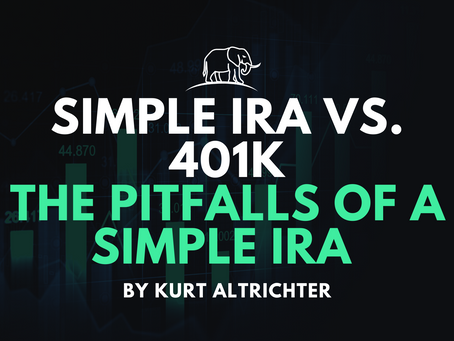 A stylized image with a large elephant graphic in the center, surrounded by financial charts and graphs. The text 'SIMPLE IRA VS 401K' is prominently displayed above the elephant, with 'The Pitfalls of a Simple IRA' written below it. The image is attributed to Kurt Altthier, and the color scheme is predominantly dark w... | Simple IRA vs. 401k | The Pitfalls of a Simple IRA | c18844fe799f8ca36e0f527ba670eac75a5430474a6f747cc72f61ee6d5af543 | 000910717446 | 0 | 0 | 58 | 11 | 0 | 0 | |