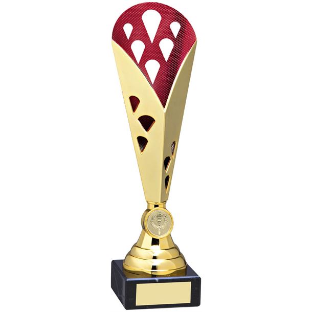 A golden trophy with a red and white patterned base and a black and gold plaque at the bottom is displayed against a white background. | Cone Trophy Cup On Marble Base Gold & Red Plastic 31cm (12.25") | 84d31948ebca6e7bead5545eff81b451203f30882dd9dbe64c404edf867e77ef | 000910688037 | 0 | 0 | 25 | 12 | 0 | 0 | |