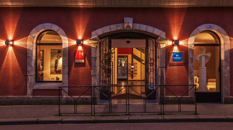 The first image shows the exterior of a building at night with a warm, inviting glow from the windows and street lamps. The building has a red facade with two arched windows and a central entrance flanked by two smaller windows. Above the entrance, there is a stone arch with a light fixture. The entrance is framed by a metal railing, and there are two signs on the wall to the left of the entrance. The street is empty, and the scene conveys a sense of calm and solitude. | Best Western Plus Kregenn Exterior. Images powered by <a href="http://web.iceportal.com" target="_blank" rel="noopener">Ice Portal</a>. | 7b1d5631b8b34dd46a8cb6e6f3a9e8000796c1fb4fe6a68921191e96a5e6243f | 000910688080 | 0 | 0 | 89 | 13 | 0 | 0 | |