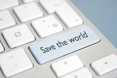 A close-up of a computer keyboard with the 'Save the World' key prominently displayed in the center. The key is white with black text and is surrounded by other keys such as 'Ctrl', 'Alt', and 'Shift'. The keyboard is placed on a surface with a blue background. | Save the worldStock Photos | 26deaf202a32469f37be11aeb6a533116a36bebe3d1e825a8ee3b1a88b959ecc | 000910688039 | 0 | 0 | 47 | 4 | 0 | 0 | |