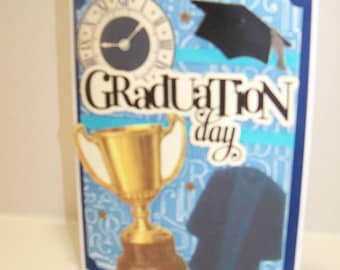 A graduation card with a blue background featuring a large golden trophy in the center, a clock above it, and a graduation cap to the right. The word 'GRADUATION' is written in large letters across the top, and 'DAY' is written below it. There are smaller text elements and decorative patterns around the trophy and clock. | Graduation greeting card | ce64468bed01d21b64e68abfc35beed2cf38afdebb317b4fa7556627191d351b | 000910687930 | 0 | 0 | 56 | 3 | 0 | 0 | |