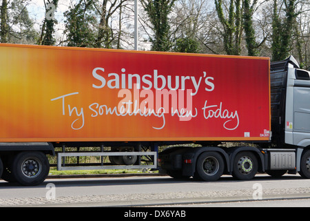 A large orange and red semi-truck with the words 'Sainsbury's Try Something New Today' written on the side is driving on a road. The truck is parked on the side of the road, and there is a clear sky above. The truck has a black cab and a large trailer attached to it. | A truck traveling along the A23 road in Coulsdon, Surrey, England. - Stock Photo | 74131e1ea4e9206c1e4719268f70b100c290dc8a539112893ed996a7212d706b | 000910688035 | 0 | 0 | 53 | 14 | 0 | 0 | |