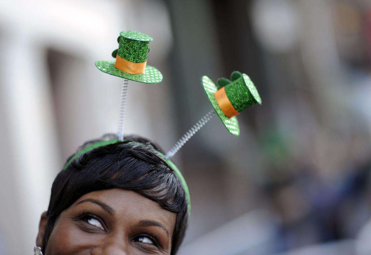 A woman with short hair is wearing a green hat with a white shamrock design on it. She is also wearing a green shamrock-shaped headband with a silver stem. | Revelers celebrate St. Patrick\xe2\x80\x99s Day from New York to Dublin | f01253ef4f823033f711d828aaf130c733aa735e4453dd7a941886e767ac74e8 | 000910717672 | 0 | 0 | 29 | 10 | 0 | 0 | |