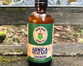 A bottle of 'Arnicare Relax Bath Lavender' essential oil is placed on a wooden surface. The label features a green background with a white and green logo, and the text 'Green Beard Herb Co.' is visible. The bottle has a black cap and is filled with a clear liquid. | Arnica Relax Bath Lavender- Full body Pain Reliever in the Bathtub | d96a36687e656dc2866d1d3be701b04b4c498c4333d497b51a5ab37ee87aa543 | 000910717466 | 0 | 0 | 49 | 11 | 0 | 0 | |