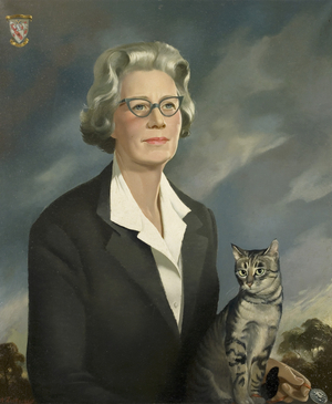 A portrait of an elderly woman with grey hair, wearing a black suit with a white shirt underneath, holding a grey tabby cat. The background features a cloudy sky with a hint of greenery. | Florence Joan Beech, 1960s (oil on canvas) | 57e0486302fdc0be826c2721462ce6364d1cab5bcf283e98781daa8c81e938da | 000910717670 | 0 | 0 | 34 | 7 | 0 | 0 | |