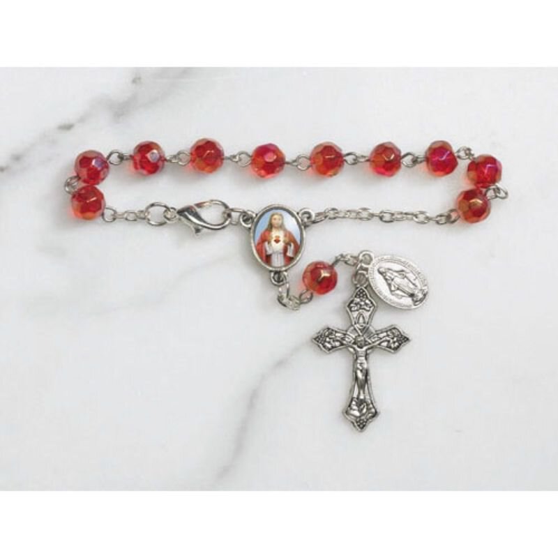 A silver crucifix with a heart-shaped pendant featuring a picture of Jesus hangs from a chain with red beads. | Sacred Heart Faceted Glass Auto Rosary - 12/pk | b4638eca2582f50761db4796403ad4821713c899d809c8659b09028df54adc9f | 000910717646 | 0 | 0 | 19 | 8 | 0 | 0 | |
