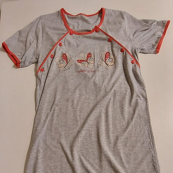 A grey t-shirt with a red collar and cuffs is laid out on a white surface. The t-shirt has a graphic design on the front featuring a red butterfly with red wings and a red body, surrounded by a red border. The design also includes the text 'BUTTERFLY' in red, with the letters 'B' and 'Y' slightly larger than the others... | Nursing nightwear size 10-12 | 531b2d7a313ec586efa7ae3ff234827a158c60cb14b2e7af07798251fbb1636c | 000910717620 | 0 | 0 | 61 | 4 | 0 | 0 | |