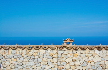 A clear blue sky above a stone wall with a decorative tile border. | Roof tile and ocean | 7ac1ad54d8d603cdbc475d53d1c1bad442240f6b4e141e8a0b71ca3ce53cde60 | 000910717700 | 0 | 0 | 13 | 4 | 0 | 0 | |