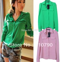 A woman is wearing a green shirt with a collar and buttons, paired with blue jeans with a silver belt buckle. | Wholesale Cheap Korean Clothes Free Shipping - Wholesale-Free Shipping Cheap Korean Style Fall Clothes Fashion Green Pink Long Sleeve Chiffon Blouse Shirt For Women 2015 Sale | 20a8a3bf503e463d61316f7e7f15dc2923399319594ade9e3ebc5e4a7662ccfa | 000910717659 | 0 | 0 | 21 | 26 | 0 | 0 | |