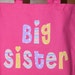 A pink tote bag with the word 'Big Sister' written in a playful, cursive font. The letters are large and prominent, with the word 'Big' on the left side and 'Sister' on the right. The letters are outlined with a white border, and the background of the bag is a solid pink color. | Large Personalized Big Sister Tote (13.5" x 13.5" x 4") - kids book bag girl library school custom name birthday gift idea flower wedding | 0b60752f14cffb347f3f2e5181055d9080920454db323d0f99a96e8703024f28 | 000910717545 | 0 | 0 | 53 | 24 | 0 | 0 | |