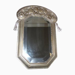 A silver-framed mirror with a decorative ribbon tied around it. The mirror has a dark, reflective surface and is set against a white background. | French Art Deco Mirror by Saugues, 1920s | acc18e41ae671f22ded82bc56db251b834d8307fcf6a5e2ec6b8c4f0d4b0ba30 | 000910718355 | 0 | 0 | 24 | 7 | 0 | 0 | |
