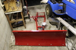 A red snowplow is parked in a garage, with a blue truck visible in the background. The garage is cluttered with various items, including a wooden shelf with tools, a ladder, and a person standing near the snowplow. | Toro Wheel Horse Snow Plow for Garden Tractor * see note | 5eb157af7997816bd276af072c22016ed110d96b88db2f5873e0de45f134c747 | 000910718323 | 0 | 0 | 38 | 11 | 0 | 0 | |