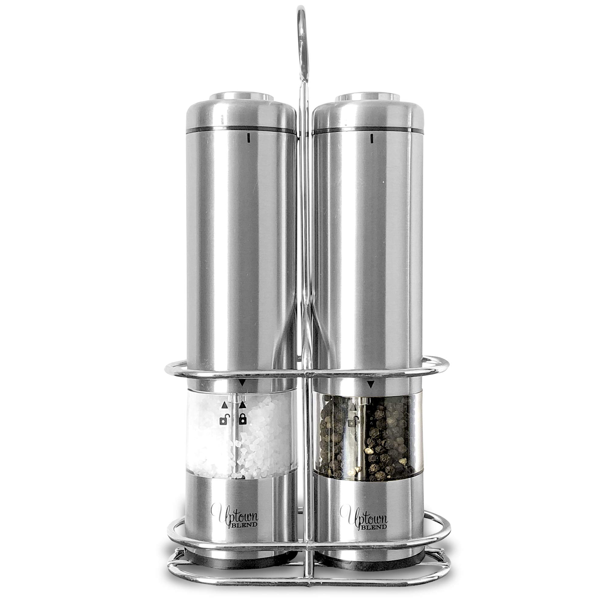 A modern kitchen appliance with two cylindrical containers, one filled with salt and the other with pepper, is displayed against a white background. The containers are made of stainless steel and have a sleek design with a metallic finish. The appliance has a simple, minimalist aesthetic with a focus on functionality. | Uptown Blend - Electric Stainless Steel Salt and Pepper Grinder Set - Battery Operated Salt&Pepper Mills with Stand - Automatic Power Shakers - 2 Ceramic Adjustable Coarse Grinders with LED Light | 096e9e582790e14e4896343eeab594caa491308f69fb67ac4051fe8330f9acd3 | 000910718321 | 0 | 0 | 51 | 31 | 0 | 0 | |