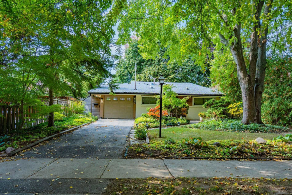 A quaint suburban house with a garage door, surrounded by lush greenery and a well-manicured lawn. The house has a white roof and beige siding, with a black lamp post in the front yard. The driveway is paved, and there are fallen leaves scattered on the sidewalk and driveway. The scene is serene and picturesque, with a... | 42 Munson Cres, Toronto | ecf18889017e50403bbb2a4da3574ce162daa12e899ff9881cf5accab8d7bf81 | 000910718203 | 0 | 0 | 61 | 4 | 0 | 0 | |