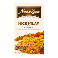 A box of Near East Rice Pilaf with Chicken is displayed. The box features a brown and beige color scheme with a Near East logo at the top. The front of the box shows a close-up of the rice pilaf with chicken, tomatoes, and herbs, along with the words '100% Natural' and 'Chicken' prominently displayed. The nutrition fac... | Near East Chicken Rice Pilaf Mix | 903737c2cedb2931a93166a93735c11361beaf01b94cbbea2e34b43ec0ab85b8 | 000910718703 | 0 | 0 | 68 | 6 | 0 | 0 | |