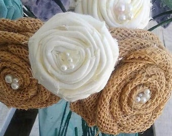 A bouquet of white roses with cream-colored petals and beige ribbons tied around the stems. The roses are adorned with white pearls and are set against a backdrop of green leaves. | Burlap and Muslin Rosettes Various sizes- set of 20, Rustic Rosettes, Rustic/Shabby Chic/Country/Barn Wedding Decor, Fabric Flowers, | ac7b26c54918fd1d506c1fe836a6c01d94d5507e273f206e2552286d13e76d4a | 000910718673 | 0 | 0 | 31 | 17 | 0 | 0 | |