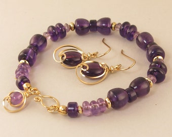 A close-up image of a purple glass bead bracelet with a gold clasp and a pair of matching earrings. The bracelet and earrings are placed on a white surface, and the lighting highlights the beads' purple hue and the gold accents. | Purple Amethyst Bracelet Gold Gift Set, Unique Gemstone Beaded Bracelet and Earrings Jewelry Gift For Her, Amethyst Jewelry | e66c9c271f05a100b3196a4fec6d8be3b540d05c2909cd2fbda9178011ba7cc2 | 000910718710 | 0 | 0 | 41 | 18 | 0 | 0 | |