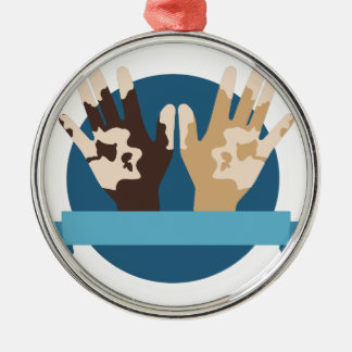 A silver-colored circular pendant with a blue border and a white background. The pendant features a stylized illustration of two hands, one brown and one white, clasped together in the center. The hands are surrounded by a blue line, and there is a red ribbon at the top of the pendant. | Vitiligo Awareness Metal Ornament | 7ce259bb947729ccb62095817d8ae1569e12c0b00ad12605c65cca8f05bf903f | 000910718801 | 0 | 0 | 51 | 4 | 0 | 0 | |