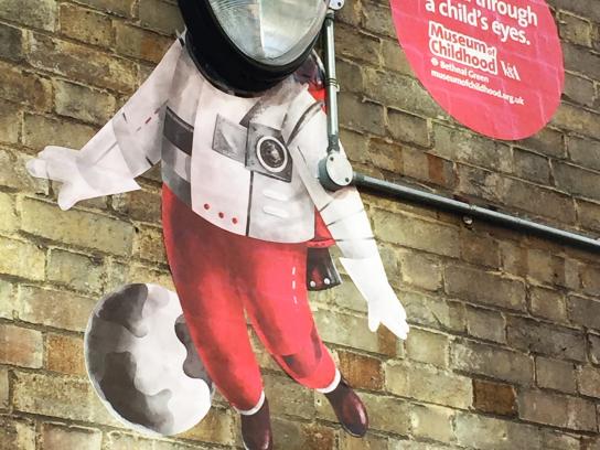 A large, colorful astronaut cutout is attached to a brick wall, with a smaller astronaut cutout floating in front of it. The larger astronaut is wearing a white space suit with red and black details, and the smaller astronaut is also in a white space suit with red and black details. The larger astronaut has a helmet wi... | V&amp;A Museum of Childhood Outdoor Ad - Spaceman | 711d0eb51d6debc3f2474963affa5c3610f7d1fa324c80fbb191113e120b55e7 | 000910718900 | 0 | 0 | 86 | 8 | 0 | 0 | |