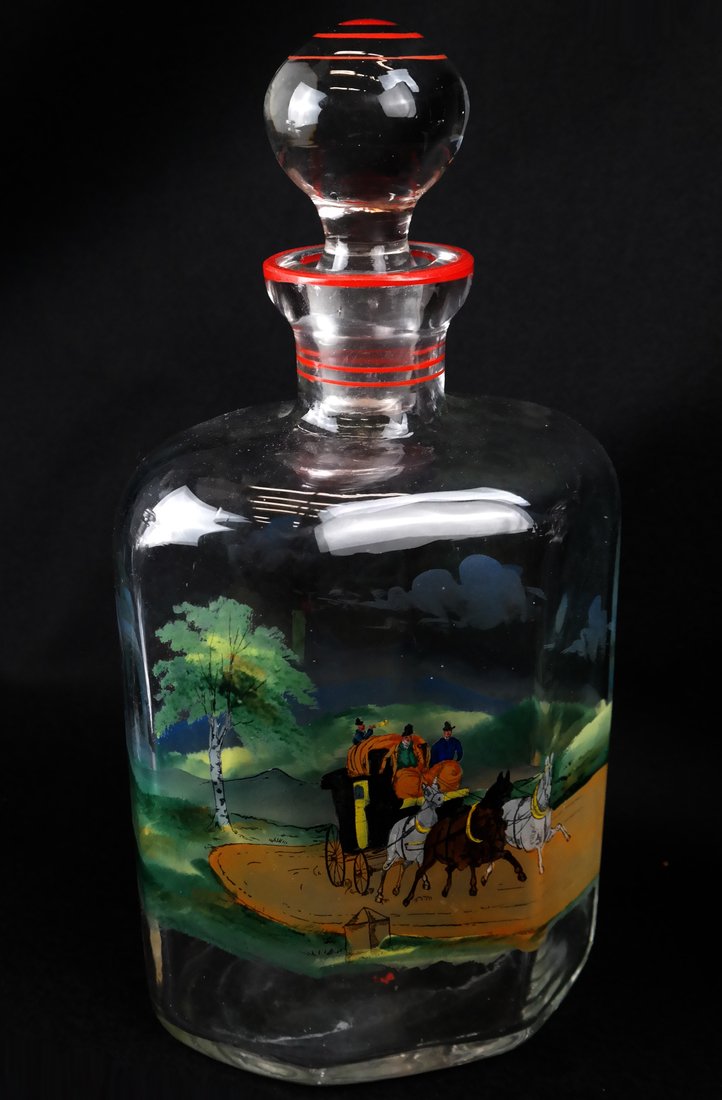A clear glass bottle with a red and white striped neck and a red and white striped stopper, containing a colorful scene of a horse-drawn carriage on a road with trees and a cloudy sky. | Three Equestrian Enameled Glass Decanters - 2 | 434e070ad04dfd7103c887833259c9d074bccc0d0e23cf6bd45db85f2ef3550e | 000910718831 | 0 | 0 | 35 | 7 | 0 | 0 | |