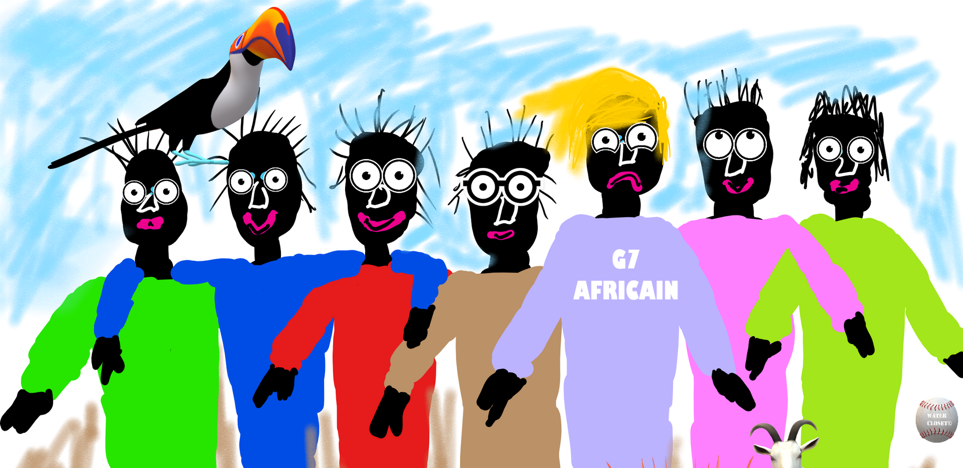A group of stick figure drawings of people and a bird, with the bird on the left side of the image. The figures are wearing colorful clothing and are arranged in a line. The first figure from the left is wearing a green shirt, the second is in a red shirt, the third is in a brown shirt, the fourth is in a purple shirt,... | G7 AFRICAIN - WATER CLOSET\xc2\xa9 | b7727ac968ad9974fdefb947b698be071a77ee69b9f439f2bce2934d5bb250b3 | 000910718661 | 0 | 0 | 89 | 5 | 0 | 0 | |