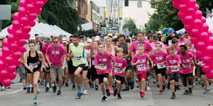 A group of people are running in a race, wearing pink shirts and bib numbers. They are running under a pink archway. The crowd is cheering them on, and there are people on the sidelines wearing pink shirts as well. The scene appears to be set in an urban environment with buildings in the background. | July 4th C.A.T. Walk & Fun Run raises over $106,000 for new mobile mammography van | e289938eaa1cc3108e39cb4f9bc441d543c059d5b15f8fdef07b670ebe3a1a83 | 000910718824 | 0 | 0 | 55 | 15 | 0 | 0 | |