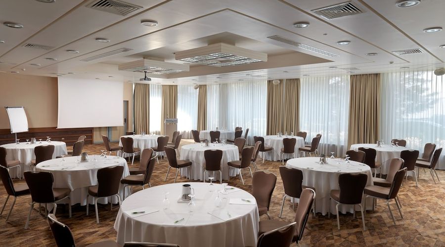 A spacious room with a high ceiling and large windows covered by sheer curtains. The room is furnished with numerous round tables covered with white tablecloths, each set with a glass, a water bottle, and a small bowl. The tables are arranged in rows, facing a large screen at the front of the room. The floor is wooden,... | Holiday Inn Athens Attica Av. Airport West-55 of 58 photos | eaa1864d90ee783e849a512692ab4c00c6f46e94294b920c2c3b5ab910c85677 | 000910719656 | 0 | 0 | 81 | 10 | 0 | 0 | |