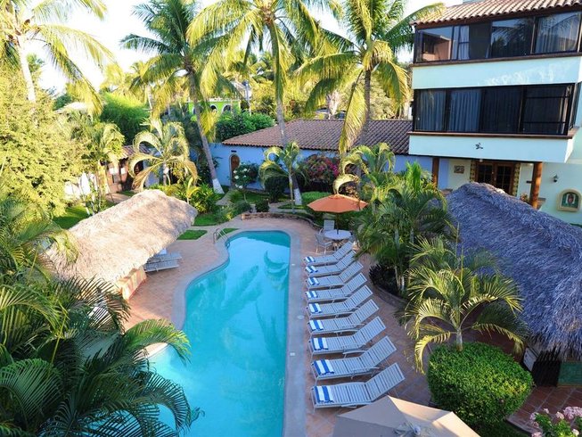 A tropical resort pool area with a clear blue swimming pool surrounded by lush greenery, palm trees, and a thatched-roof hut. The pool is lined with multiple sun loungers, some with blue towels on them. The scene is serene and inviting, with a view of a building with a balcony in the background. | 10 Days Detox, Meditation, and Yoga Retreat Mexico | 138bf30a9ed7892658be40c4cce6b9078191bc5e9d5fa86d878fe75ab199792e | 000910719655 | 0 | 0 | 53 | 8 | 0 | 0 | |