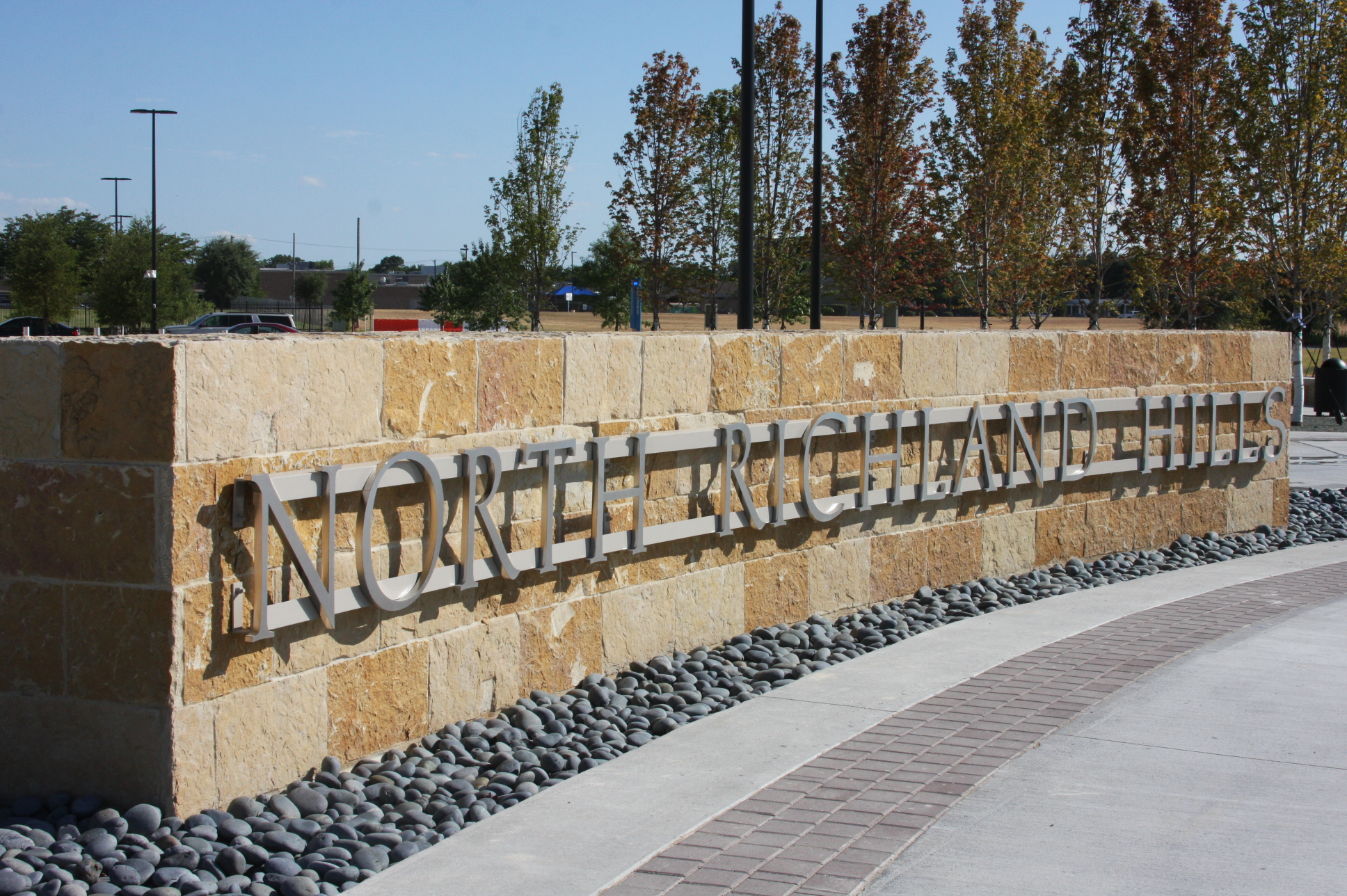 A stone monument with the words 'North Ridge High School' engraved on it stands in front of a school building. The monument is surrounded by a gravel area with a few scattered rocks. Behind the monument, there is a parking lot with several cars and a truck. The school building is partially visible, with a large tree in... | North Richland Hills City Complex | c2fd1778a4d33d694ec4795df686c77cbe84380ec9b0f76b680343141333dee0 | 000910719713 | 0 | 0 | 60 | 5 | 0 | 0 | |