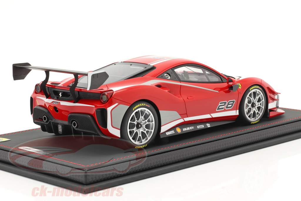 A red and white model car with the number 28 on the side is displayed on a black base with a red logo. The car has a sleek design with a low profile and aerodynamic features. The base has a reflective surface and the logo is embossed. | Ferrari 488 Challenge Evo #28 2020 rood / Wit 1:18 BBR | c1da0102db65ecc36d698ee2b2f26d459d670cdc80810ecaeaaed4799d584cc3 | 000910719601 | 0 | 0 | 47 | 11 | 0 | 0 | |