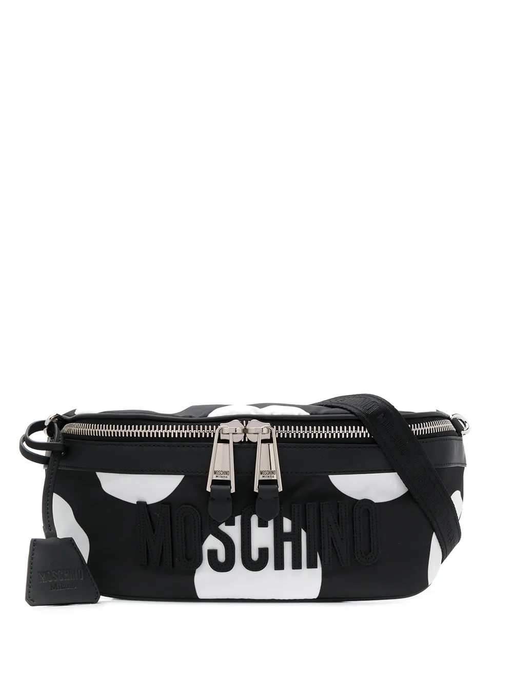 A black and white patterned shoulder bag with a zipper closure and a metal zipper pull is displayed against a white background. The bag features a brand logo on the front and has a strap with a buckle. | MOSCHINO | Moschino Polka Dot Belt Bag - Black | Goxip | b857b596026ec3b377cb484954f12dd2faa397d72b4505b602712d8ac7e39e8d | 000910718257 | 0 | 0 | 38 | 11 | 0 | 0 | |