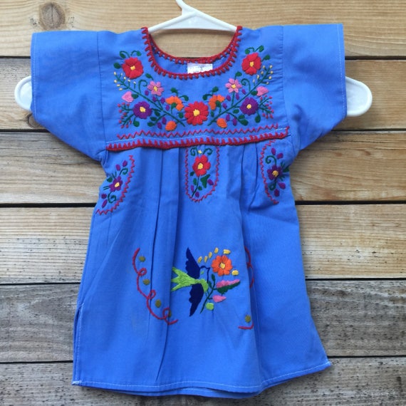 A blue dress with a floral embroidery design is hanging on a wooden hanger against a wooden background. The dress has a fitted bodice with a round neckline and short sleeves. The embroidery features a variety of flowers and leaves in red, orange, yellow, and green colors. The dress has a zipper closure at the back and ... | girls mexican dress - pom pom trim - kids embroidered mexican dress - custom baby mexican dress - infant mexican dress | 35b7a11d2dfce610366e9ef73a819b5c1939ae280c5481e892d62745ba226b84 | 000910719946 | 0 | 0 | 63 | 21 | 0 | 0 | |