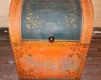 A vintage orange and green wooden jukebox with intricate floral patterns and a metal coin slot on the front. The jukebox has a faded and worn appearance, with visible signs of age and use. It is placed on a wooden floor, and the background is a plain wooden wall. | Antique Old Country Store Counter Bin | 44e87e1e1ae02eeb112ed64167fae32296b6bb5d6821c29f264c7cdcb8000f62 | 000910719954 | 0 | 0 | 49 | 6 | 0 | 0 | |