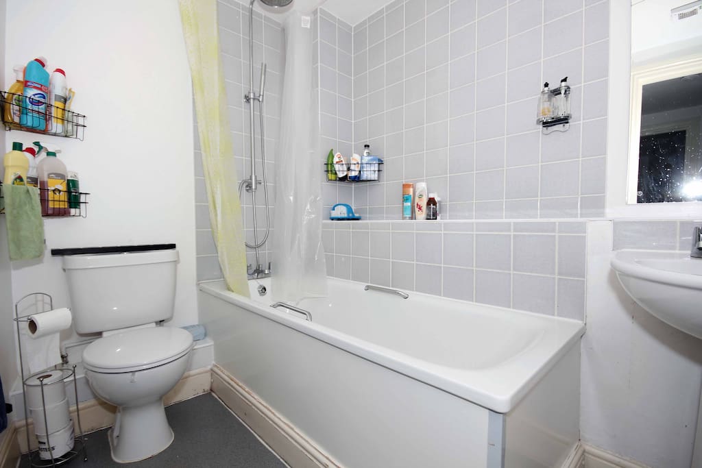 A white toilet with a black seat and lid is positioned to the left of a white bathtub with a silver faucet. The bathtub is surrounded by white tiles on the walls and floor. Above the bathtub, there are several bottles and a shower head. To the left of the toilet, there is a toilet paper holder with a roll of toilet pap... | Clean fresh bathroom with a full size bath and convenient shower. | ddc6be93150f6336cbb2ff419315e32e81108e67b77a5864d21efee4046f0750 | 000910720255 | 0 | 0 | 78 | 11 | 0 | 0 | |