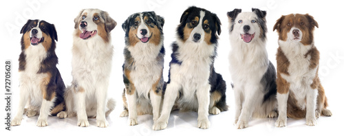 A group of five dogs with various breeds and colors is standing in a row against a white background. From left to right, the first dog has a black and white coat with a white chest and a black muzzle. The second dog has a brown and white coat with a white chest and a brown muzzle. The third dog has a black, white, and ... | Photographie australian shepherds | cf54a8a92830954aae535a83e46fdc5b86bb031c1f62118498530a123db7344f | 000910720235 | 0 | 0 | 109 | 3 | 0 | 0 | |