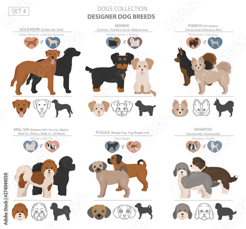 A collection of dog breeds is displayed in a set of four rows, each row containing a different breed. The breeds are illustrated in a stylized manner with a focus on their distinctive features. The top row features a black dog with a white chest, a brown dog with a white muzzle, a black dog with a white chest, and a br... | Photo Designer dogs, crossbreed, hybrid mix pooches collection isolated on white | 71651b869513154348485bd191e540930fb04ad51e4d04c320b7acc6fba85848 | 000910720168 | 0 | 0 | 115 | 11 | 0 | 0 | |
