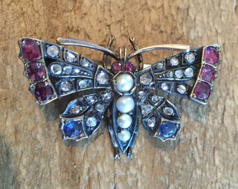 A detailed silver butterfly brooch with intricate designs and a cluster of colorful gemstones on its wings is displayed on a wooden surface. | Antique Diamond Ruby Sapphire Butterfly Brooch | b60a2810611cdd18e718dc18bf43db8d77a9a1def3996d3238e40c256d3b525e | 000910720865 | 0 | 0 | 23 | 6 | 0 | 0 | |
