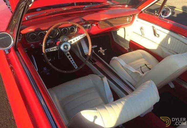 The interior of a vintage red car with a white leather seat, a wooden dashboard, and a classic steering wheel. The car has a classic design with a prominent gear shift lever and a side mirror visible. | Ford Mustang Cabrio Cabriolet / Roadster 1965 Red Car for Sale. 560737 | 95534fc9124ce6f5c5192776f0b4c2b35ae807c2cebe78490f852f4383e368b2 | 000910721030 | 0 | 0 | 37 | 12 | 0 | 0 | |