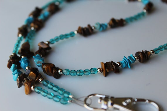 A close-up view of a blue and brown beaded necklace with a silver clasp. The beads are predominantly blue with some brown and silver accents. The necklace is laid out on a white surface, and the focus is on the beads and clasp. | Beaded Lanyard ID Badge Holder, Turquoise & Brown | ea9d7e18c96bea7c3f71773763eec81868baa34337a4105d859ace4a977c1126 | 000910721085 | 0 | 0 | 43 | 8 | 0 | 0 | |