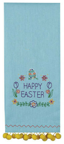 A blue fabric with a white embroidered design of a bunny, flowers, and the phrase 'Happy Easter' in a decorative font. The fabric is laid flat with a row of yellow pom-pom balls at the bottom edge. | Happy Easter kitchen towel | 30ae39383d680703a82804a19cac7b2099166656c01b4aa721fa21a36b81f456 | 000910722483 | 0 | 0 | 37 | 4 | 0 | 0 | |