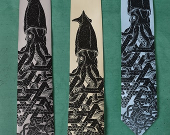 Three ties with different patterns are laid out on a green surface. The first tie on the left has a black and white pattern featuring an octopus design. The second tie in the middle has a black and white pattern with a similar octopus design, but the octopus is facing the opposite direction. The third tie on the right ... | Squid Tie - SILK Giant Squid Necktie - Surreal Art - Gift for Boyfriend - Op Art - Silk Necktie - Surrealism - Weird Art - Impossible Squid | b63f7ac5e8678946c8afcce58ad56b001101d0869560077056f187cb89a6aabc | 000910722554 | 0 | 0 | 80 | 28 | 0 | 0 | |