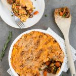 A rustic casserole dish with a golden-brown crust and visible layers of ingredients is placed on a kitchen counter. The dish is garnished with chopped carrots and herbs, and a wooden spoon rests beside it. In the background, there is a plate with a similar casserole dish and a fork. | Vegan Shepherd’s Pie | 004aa68d2876e7b72a91eff4172c31921937b3aa56800ad194cdbb1f4b3dc53c | 000910722545 | 0 | 0 | 50 | 3 | 0 | 0 |