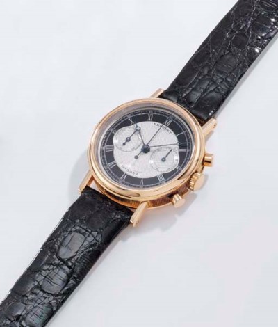 A gold wristwatch with a black leather strap is displayed on a white background. The watch has a white dial with black Roman numerals, two sub-dials, and gold hands. The case is gold with a gold crown, and the watch is set to approximately 10:10. | Breguet. A fine 18K pink gold | e3b724cb51b211fe88d3a8ade1393a69b5146b760293d243fcccbc9a90a45d2e | 000910722597 | 0 | 0 | 45 | 6 | 0 | 0 | |