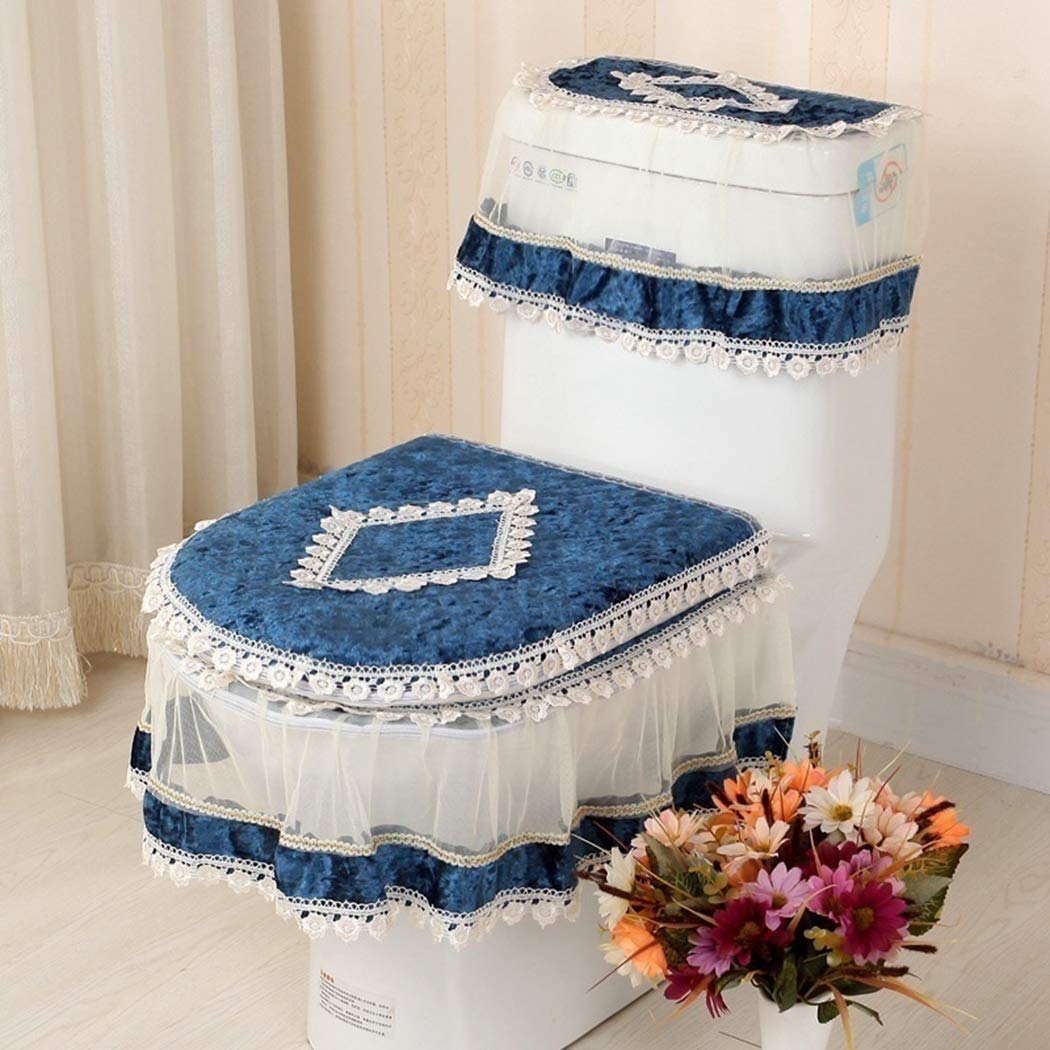 A white toilet with a blue and white seat cover and a matching blue and white toilet lid cover. The toilet is placed on a tiled floor, and there is a white vase with a bouquet of flowers on the right side of the toilet. The flowers are in shades of pink, orange, and yellow. | Toilet Cover,JUSTDOLIFE 3PCS Toilet Cover Set Elegant Lace Toilet Seat Cover Toilet Tank Lid Cover | d1be27450a3d60cea28c106260f92e0a276f2665b5e8886a18951a8b1158d2d5 | 000910722582 | 0 | 0 | 55 | 15 | 0 | 0 | |