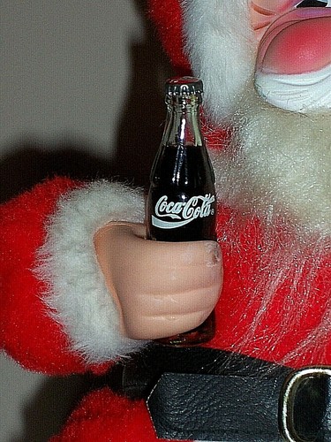 A close-up of a Coca-Cola bottle held by a hand wearing a Santa Claus costume. The hand is wearing a black belt with a buckle. The Santa Claus costume has a red jacket with white fur trim around the hood and cuffs. The background is out of focus, but it appears to be a festive setting with a hint of green and red color... | Replacement 3" Coca Cola Bottle for Rushton Santas- Makes Coke Santas complete. | e13f1c23b80d0e02980ccc22d9adbc2330ed363ba796766eea74123ef8ce9ae3 | 000910722750 | 0 | 0 | 64 | 12 | 0 | 0 | |