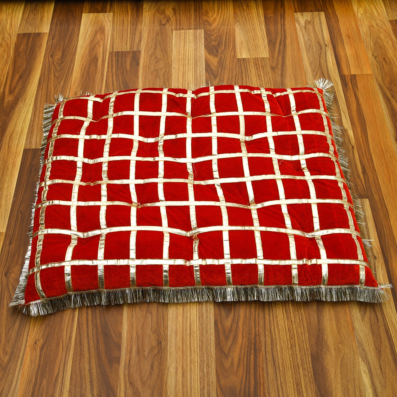 A red and white checkered cushion with a tassel fringe is placed on a wooden floor. | Puja Prayer Mat For Sitting In Pooja Room, (heavy Check Velvet) | 0208c778ba22558ddcb2df7f62f2bcd6741f79035f3ce76a46fa38ca32936363 | 000910722548 | 0 | 0 | 16 | 11 | 0 | 0 | |