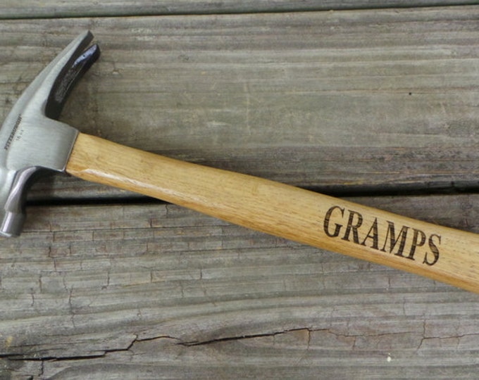 A hammer with a wooden handle and a metal head is lying on a wooden surface. The hammer has the word 'GRAMPS' engraved on the handle. | Engraved Wooden Handled Hammer - Personalized Hammer - Gift for Granddad - Gift for Dad - Groomsmen Gift | 5fb7240a8339ca39735902e4cb1235be17d19529de32d1d27b0c135497d074c2 | 000910722847 | 0 | 0 | 26 | 18 | 0 | 0 | |