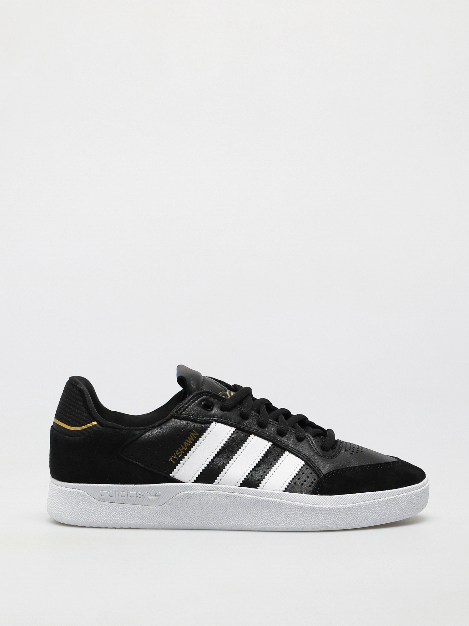 A black and white sneaker with gold accents is displayed against a white background. The sneaker has a black upper with white stripes and a white sole. The brand name 'adidas' is visible on the side of the sneaker. | adidas Tyshawn Low Shoes (cblack/ftwwht/goldmt) | 9d36e61edca97ffce0e4097bcc755653bc2f93afffcfdc8e784b34389571156d | 000910722861 | 0 | 0 | 39 | 5 | 0 | 0 | |