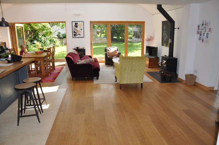 A spacious living room with a large window, a yellow armchair, a purple sofa, and a wooden floor. There is a dining table with chairs, a fireplace, and a kitchen area with a counter and stools. The room has a warm and inviting atmosphere. | Fantastic Open Plan family house - Newick - Bungalow | 05021797ac1ee457a2db6fb5b592086885e61c6e45b8df035fbfa38ea5f01b84 | 000910723251 | 0 | 0 | 44 | 9 | 0 | 0 | |